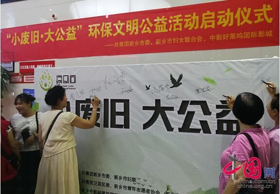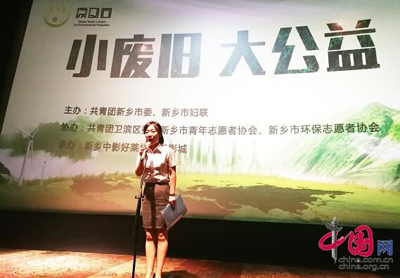 中國網(wǎng)6月5日訊 6月5日是世界環(huán)境日,6月5日上午9時30分許,由共青團新鄉(xiāng)市委、新鄉(xiāng)市婦女聯(lián)合會主辦的新鄉(xiāng)市“小廢舊 大公益”文明環(huán)保我先行公益活動在新鄉(xiāng)市衛(wèi)濱區(qū)中影好萊塢國際影城5樓3號廳舉行。新鄉(xiāng)市青年志愿者協(xié)會代表、新鄉(xiāng)市環(huán)保志愿者協(xié)會代表、環(huán)衛(wèi)工代表、婦女代表、志愿者團隊代表、大學生代表等300余人參加了活動。